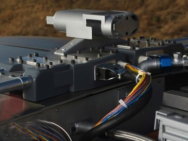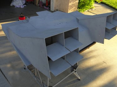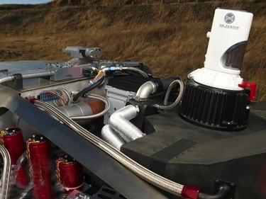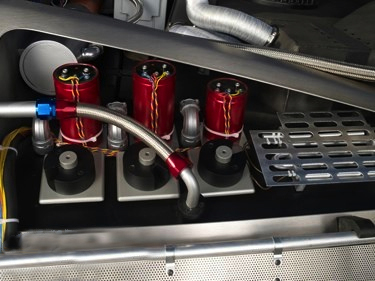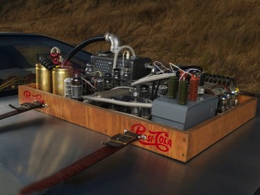 Most of the props on the rear of the car were missing, and thus recreated. The large silver tube behind the drivers side (typically a Janitrol container on some of the other cars) was a rough creation on this particular car. We recreated the same look for this piece, along with the orange hose to the passenger side. A silver box was created, along with two heat sinks installed on top. Various pieces were extensively researched for the props located on the left and right side pontoons. A Mr. Fusion base was created along with the proper coffee grinder on top.